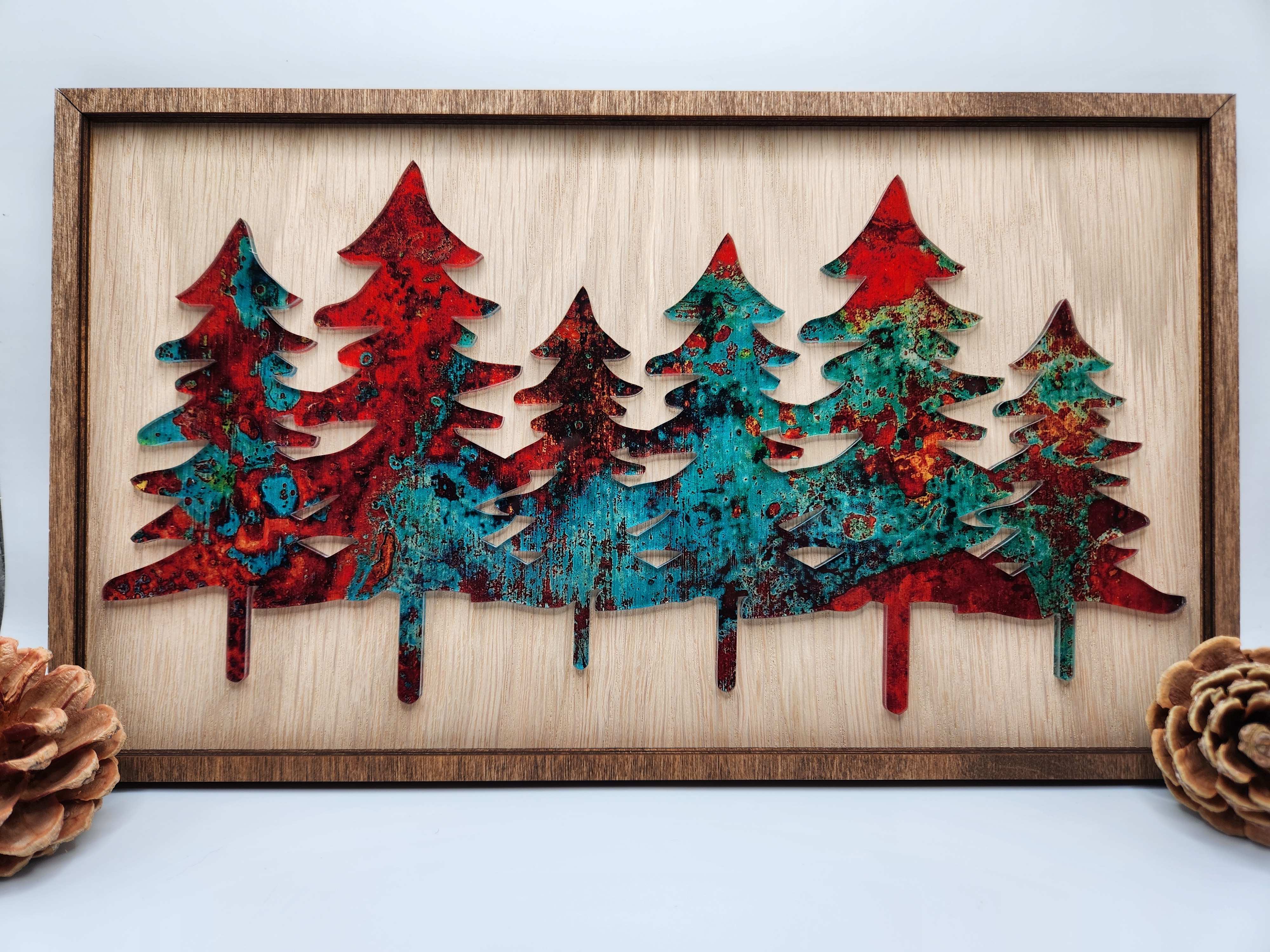 The acrylic is just stunning on this sign. The pattern is scattered which makes each sign unique and beautiful! Sign is made of stained wood with wood frame and acrylic trees.