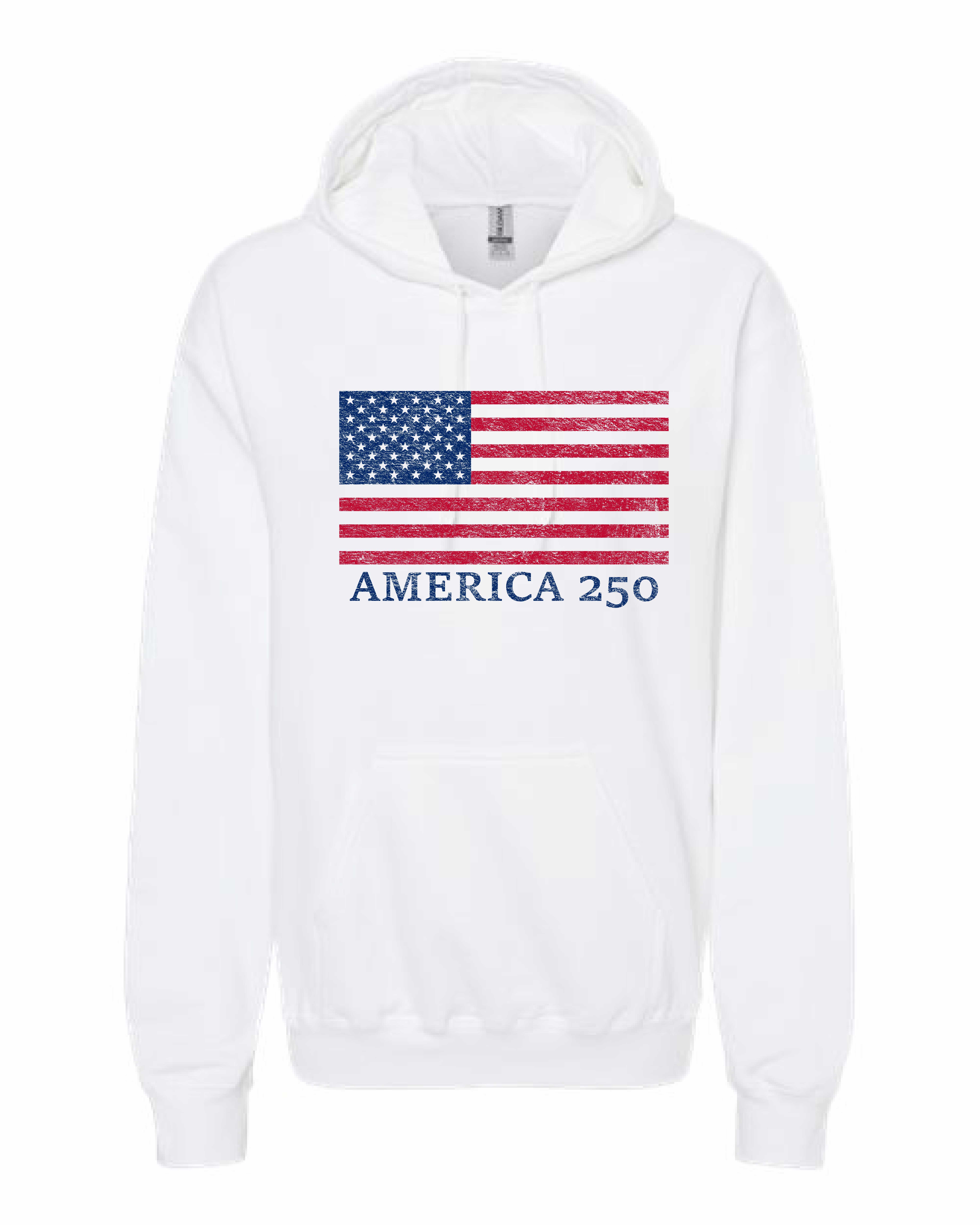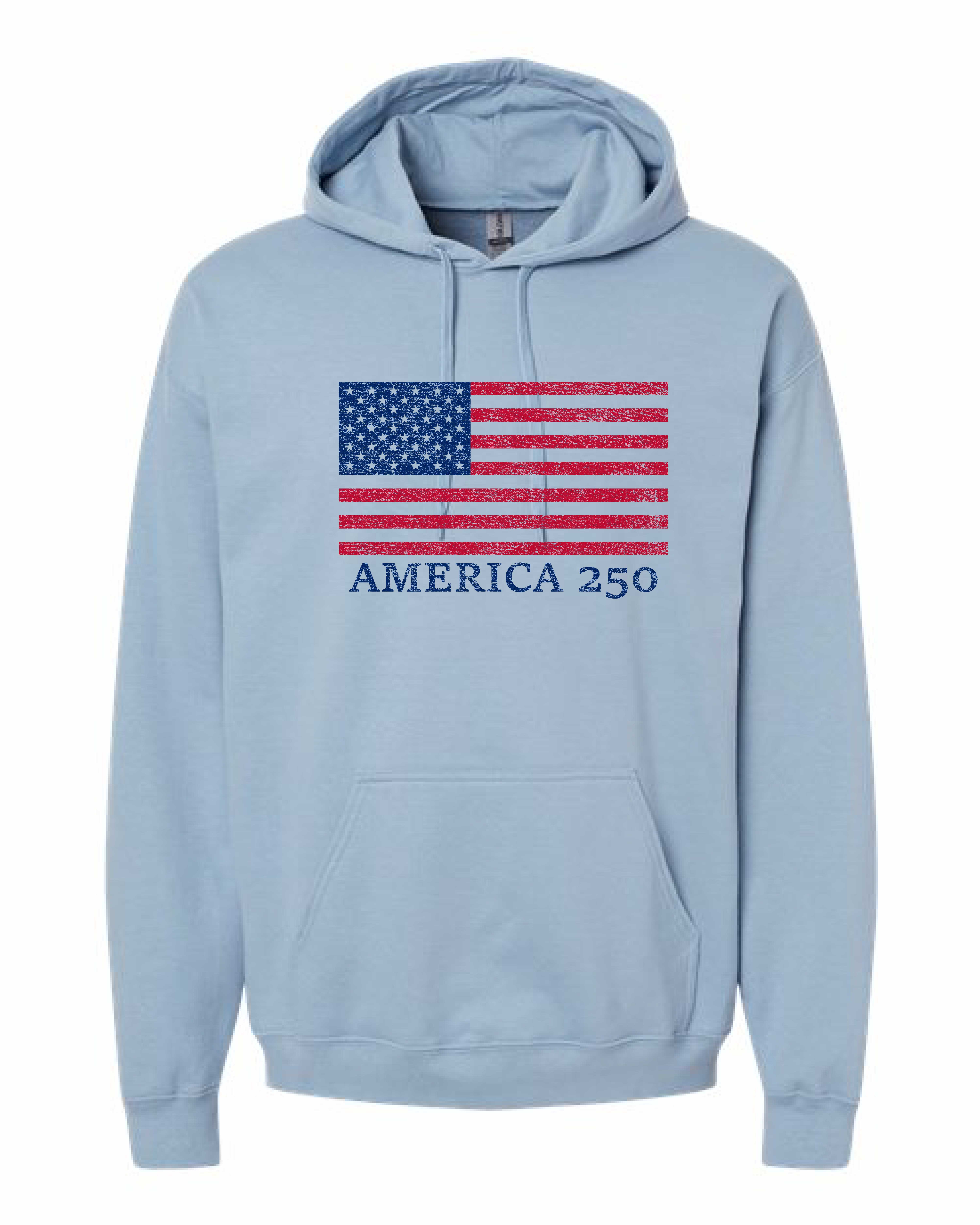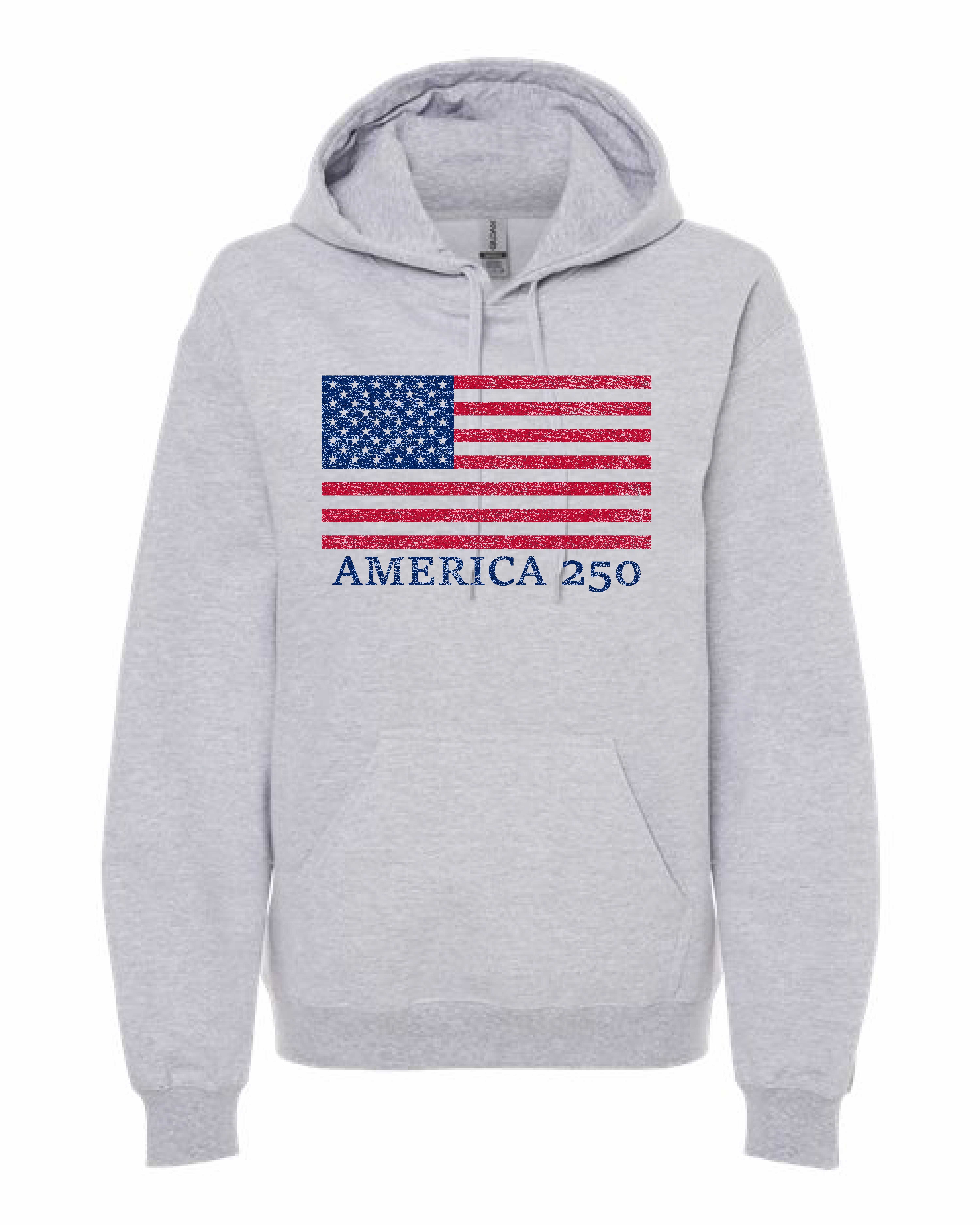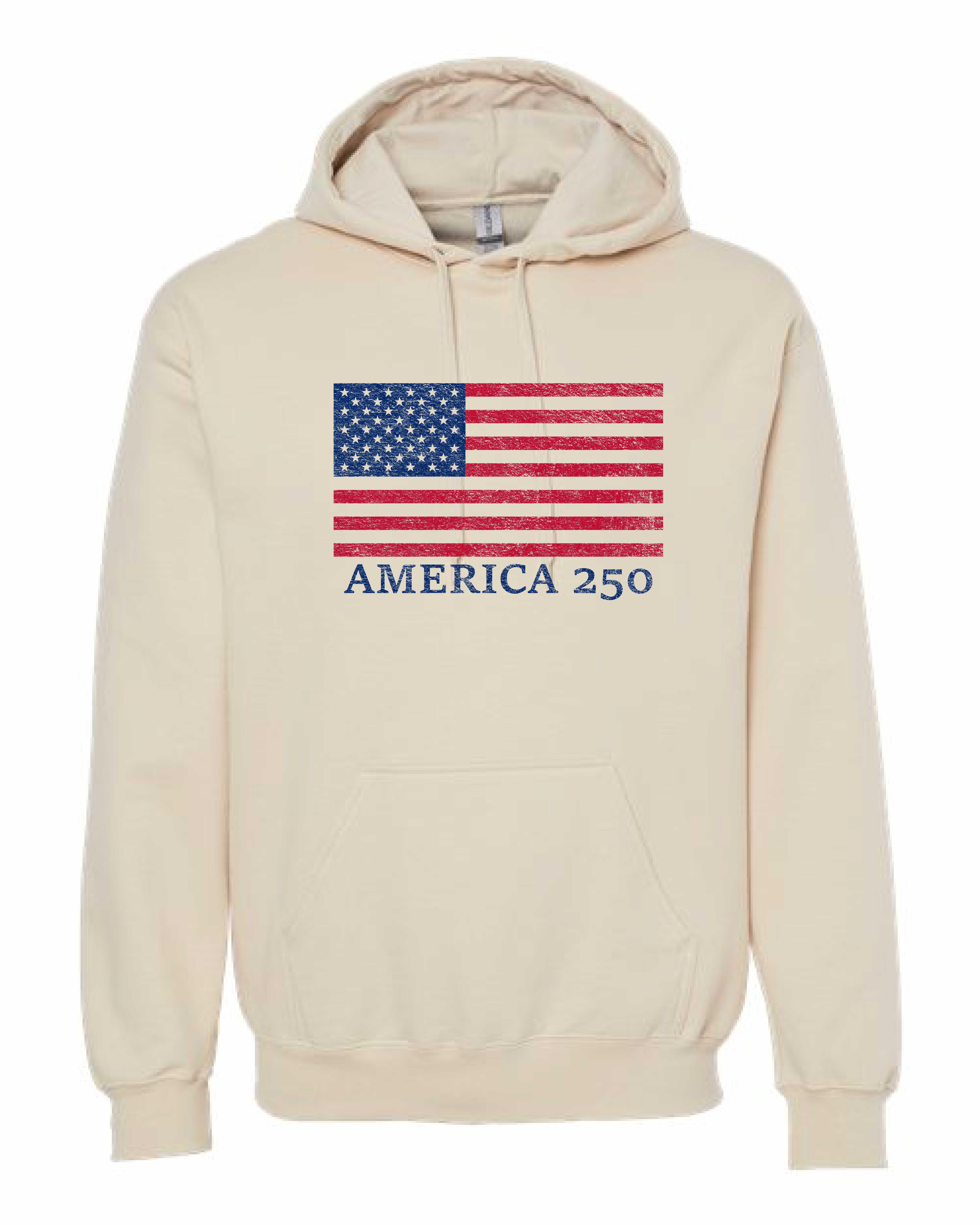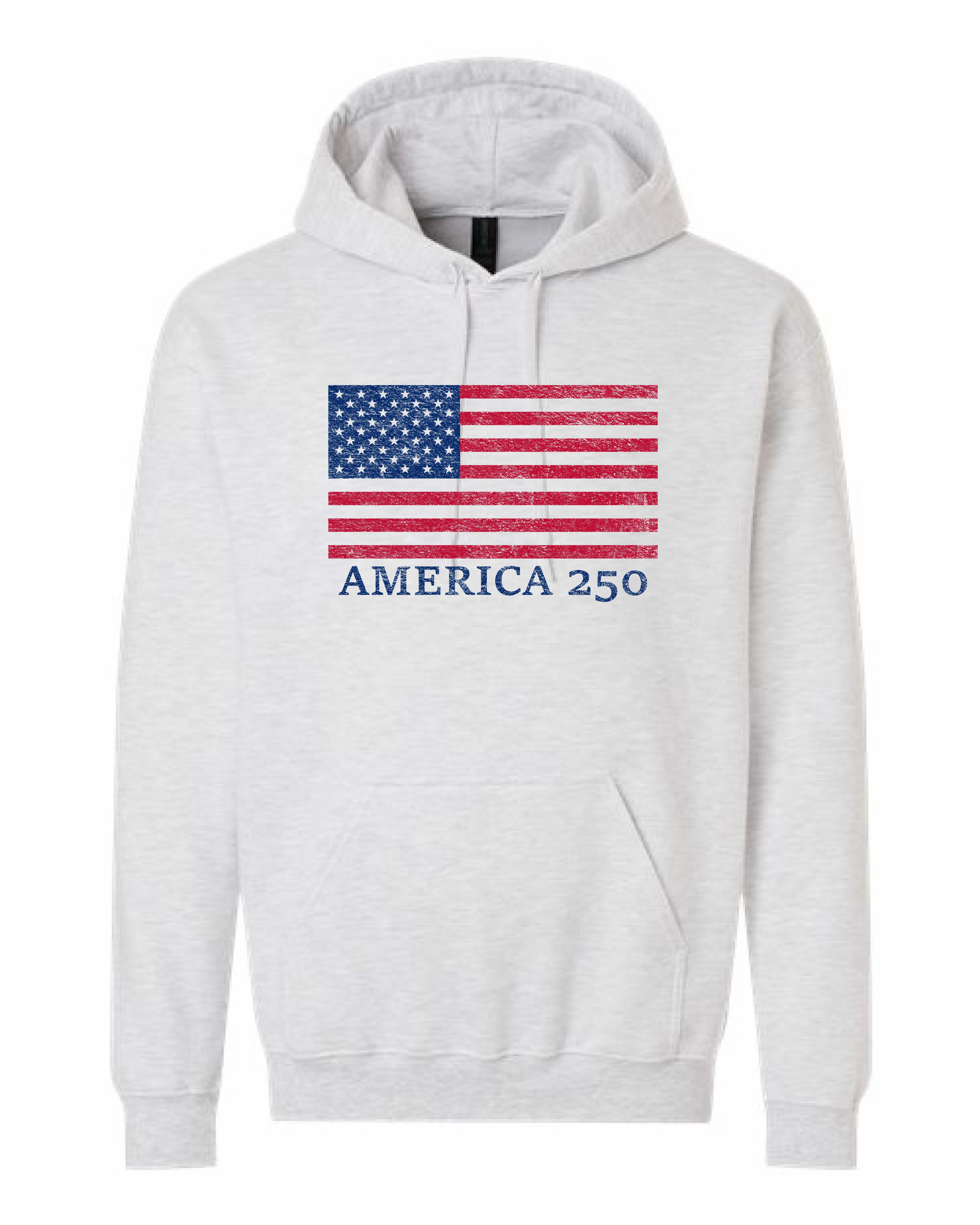 Soft unisex Gildan hooded sweatshirt with a print to celebrate America’s 250th birthday Choose from a Grey, White, Sand, Stone Blue, Brown Savanna or Ash sweatshirt.