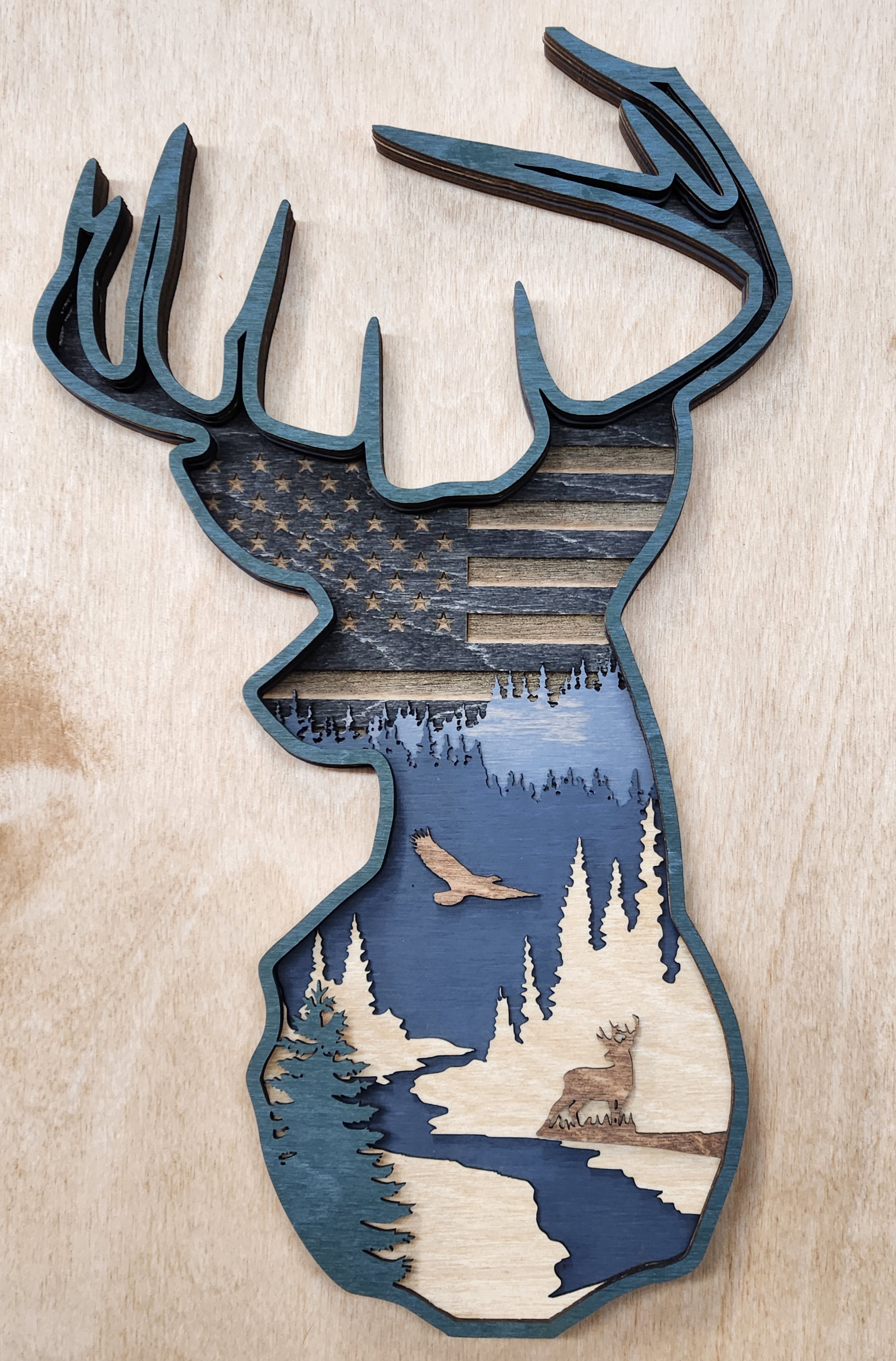 For the hunter or nature lover, this gorgeous 6 layer scenic valley is a unique addition to any room. Each layer is stained to complement each other and laser cut.