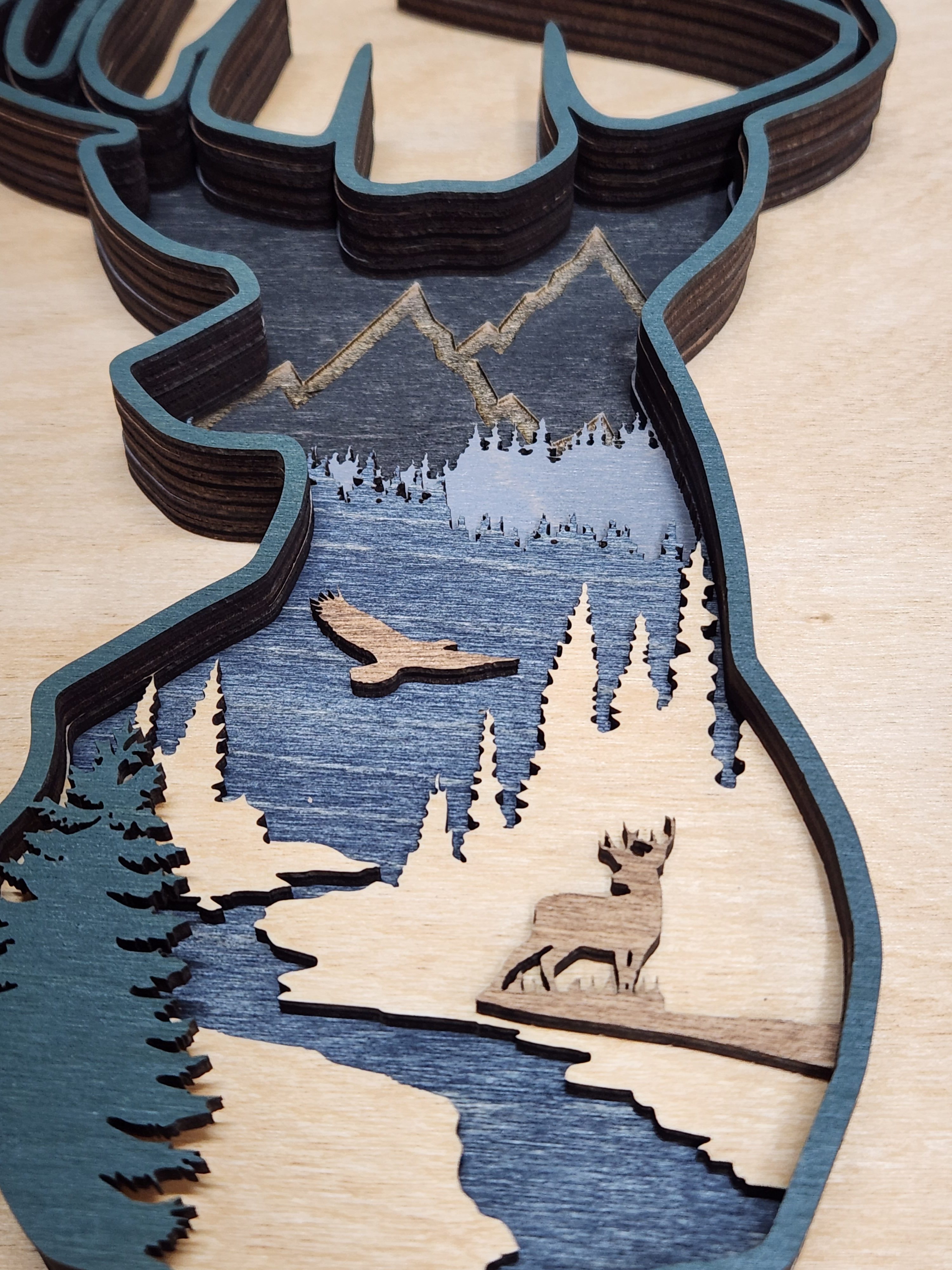 For the hunter or nature lover, this gorgeous 6 layer scenic valley is a unique addition to any room. Each layer is stained to complement each other and laser cut.