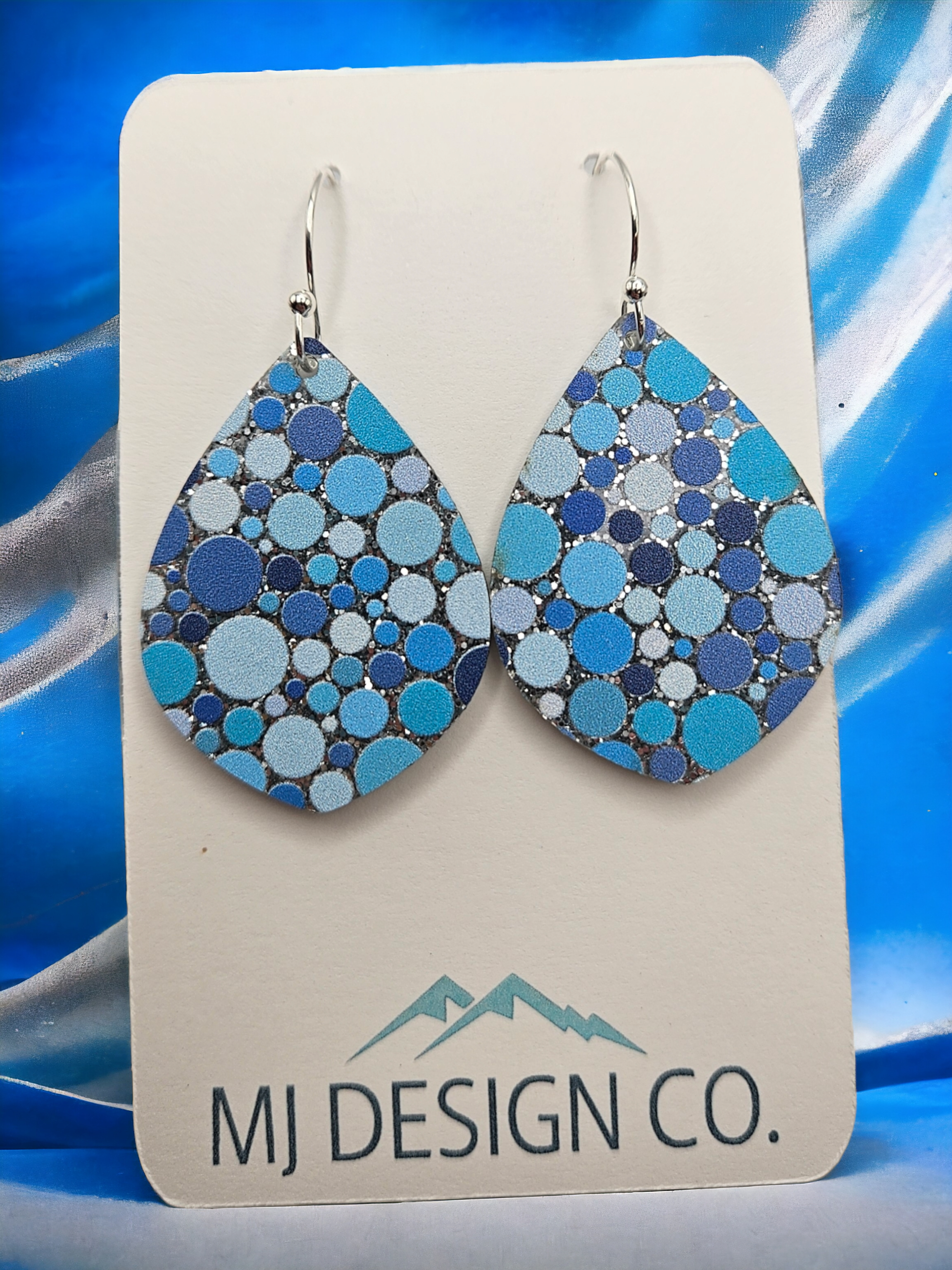 Lightweight 1.5″ acrylic earrings that have a beautiful glitter background with a blue circle pattern on top. Just the right amount of sparkle and shine!