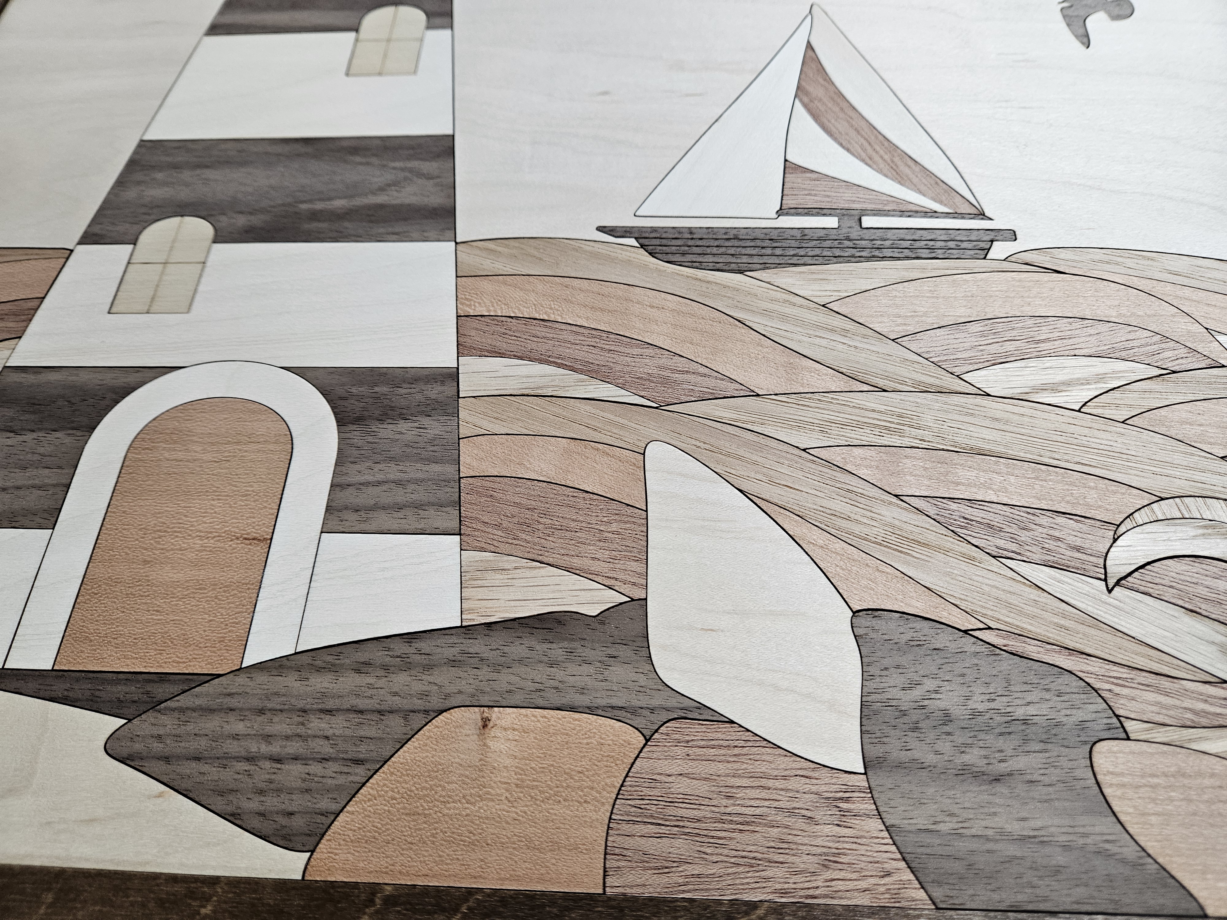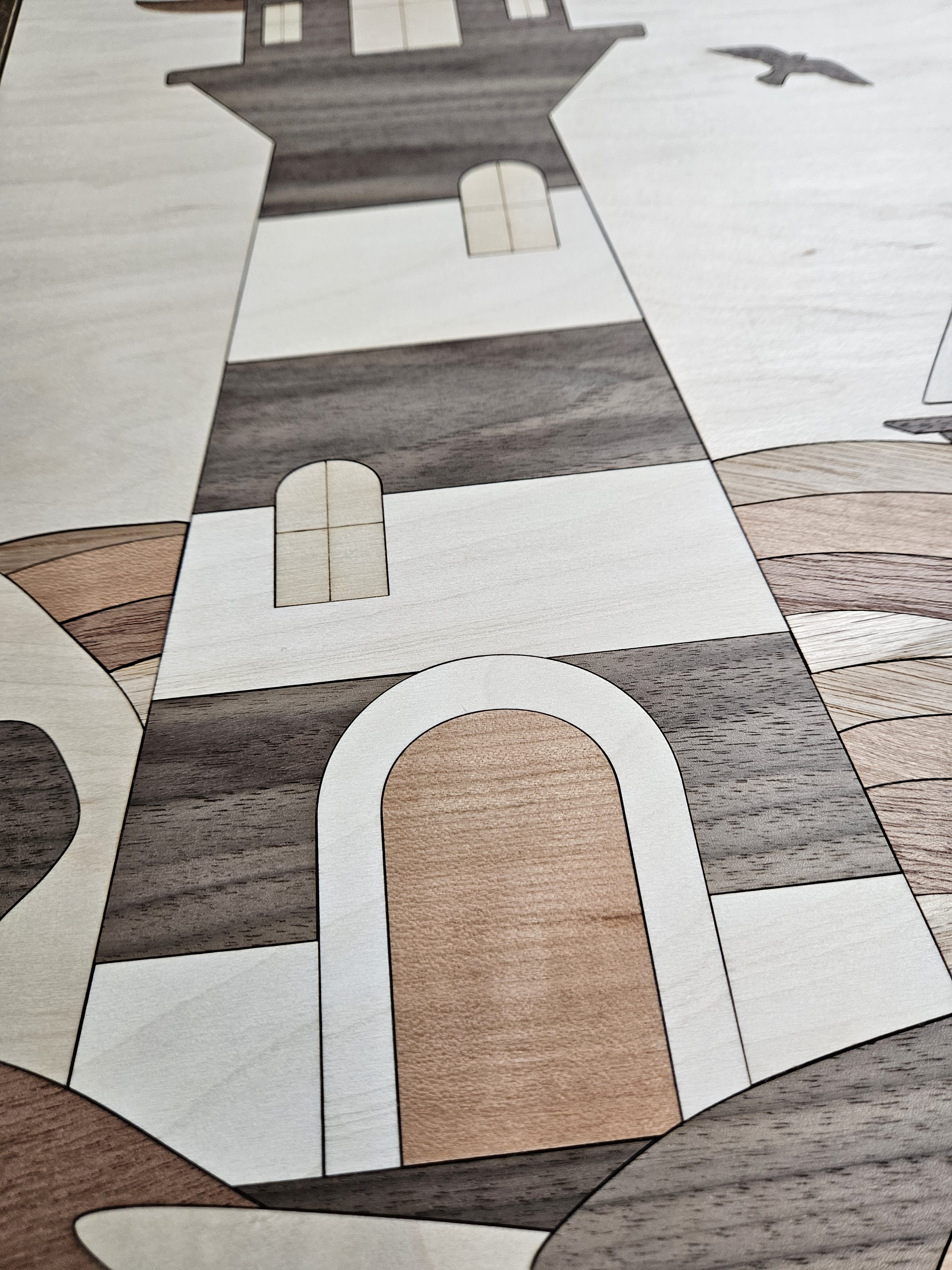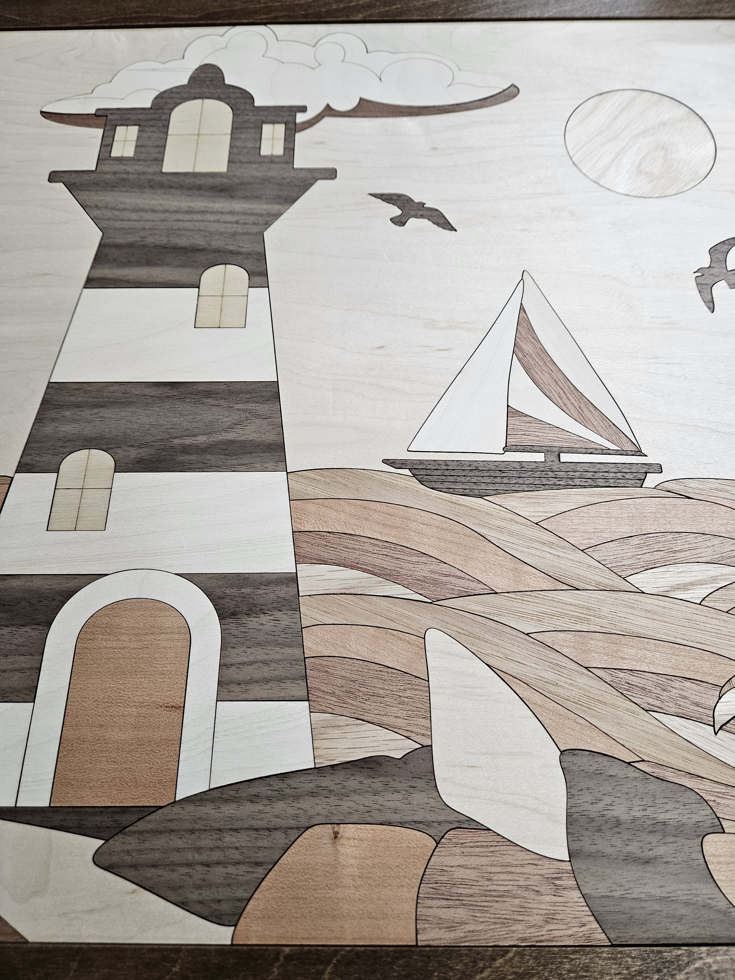 This gorgeous lighthouse is meticulously pieced together with laser cut pieces to fit precisely into place to create this beautiful piece of artwork. The lighthouse consists of 9 different types of wood and a gorgeous dark walnut frame.