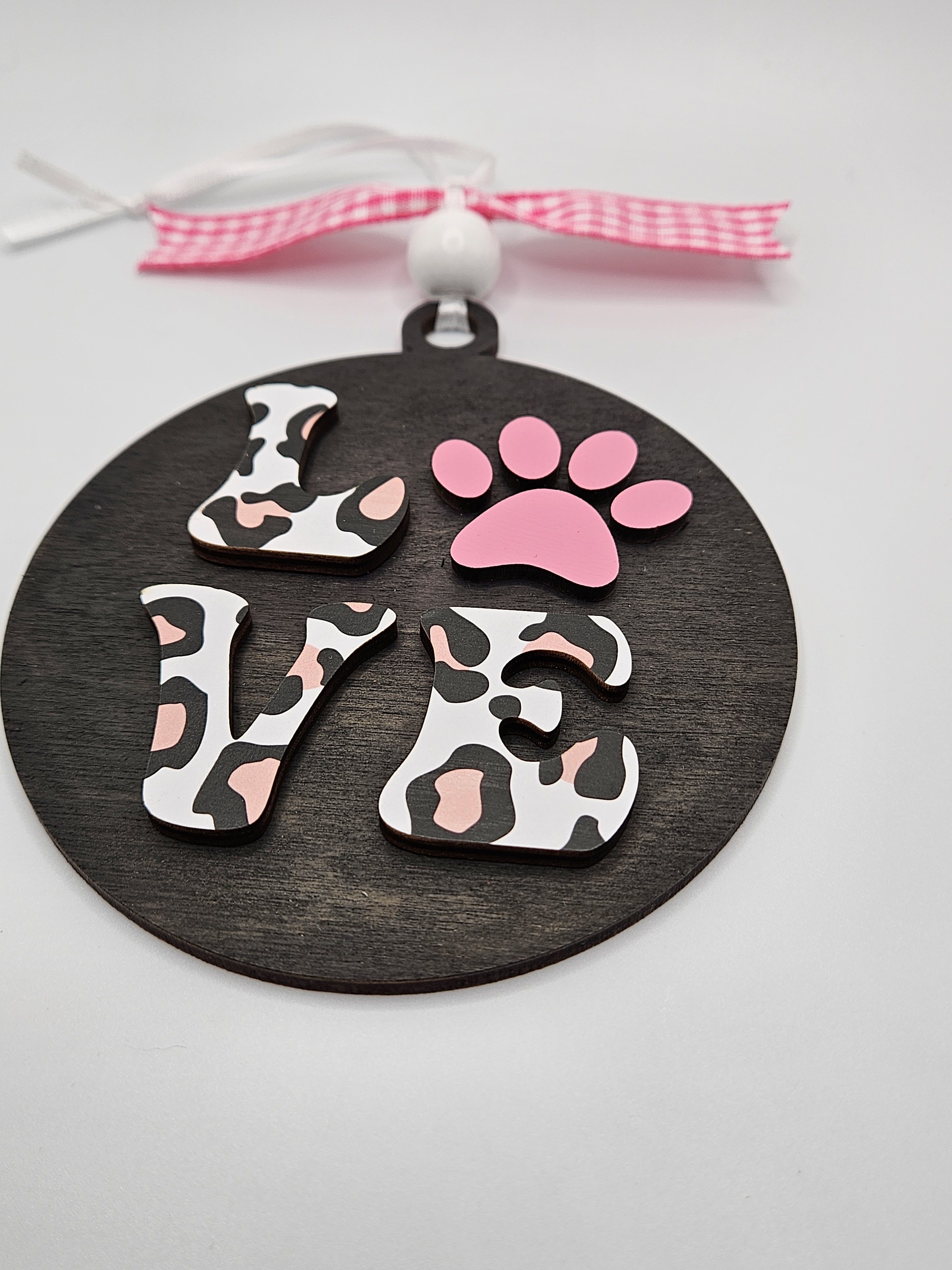 Cute Valentine’s ornament with leopard print letters with a paw print.