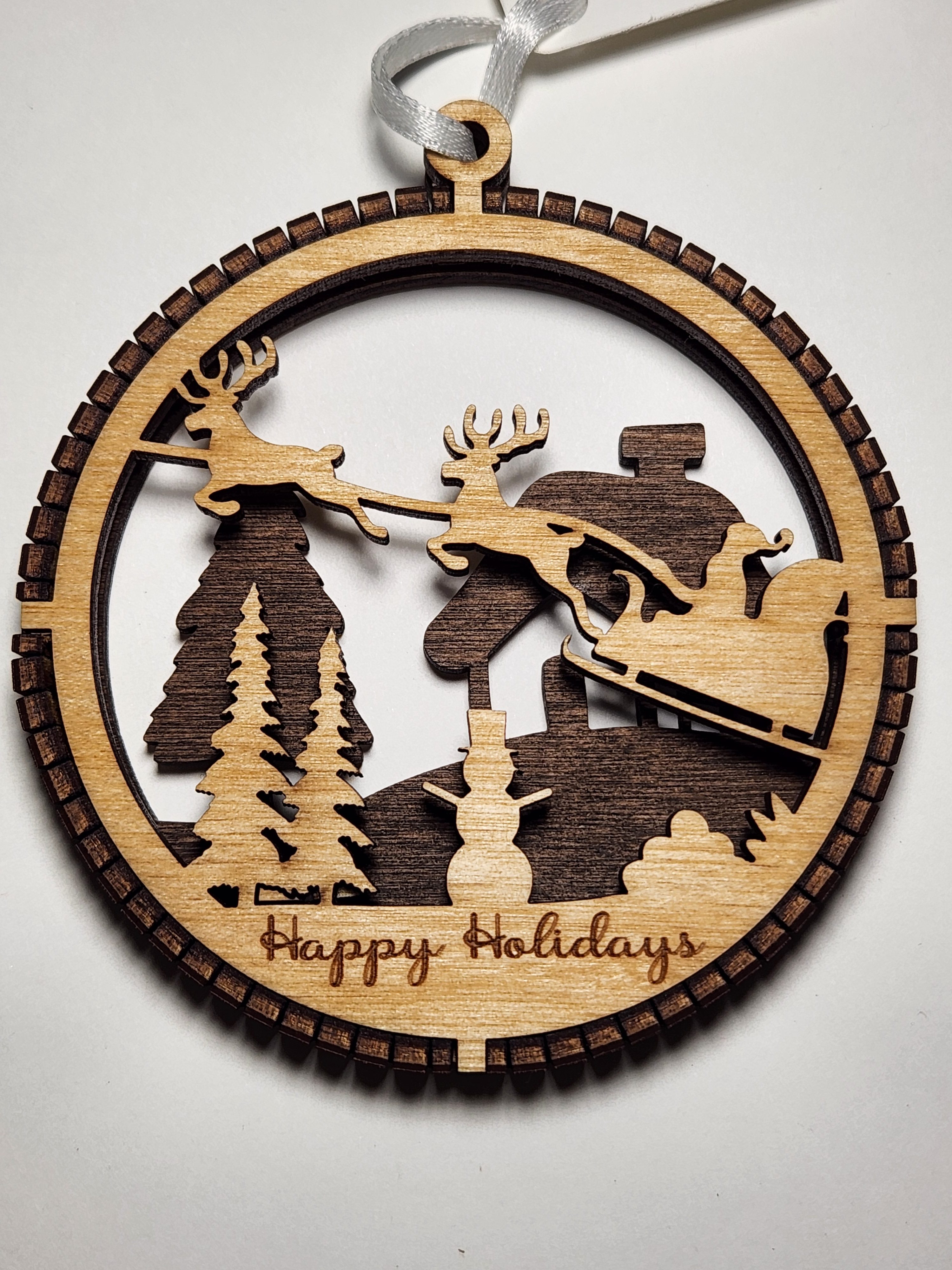 Double layer, laser cut and engraved Christmas ornaments with a wood edge. These unique ornaments have 2 layers of cut and engraved scenery. Then a detailed wood edge is snapped into place to hold both together. Give as a gift or keep for your own tree. These ornaments are lightweight and made of Baltic Birch.