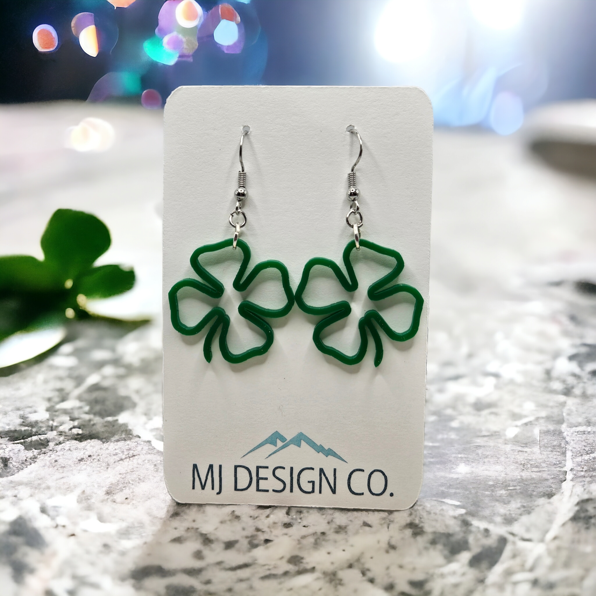 Lightweight 1″ clover shaped earrings. Each pair is made from a vibrant green acrylic.